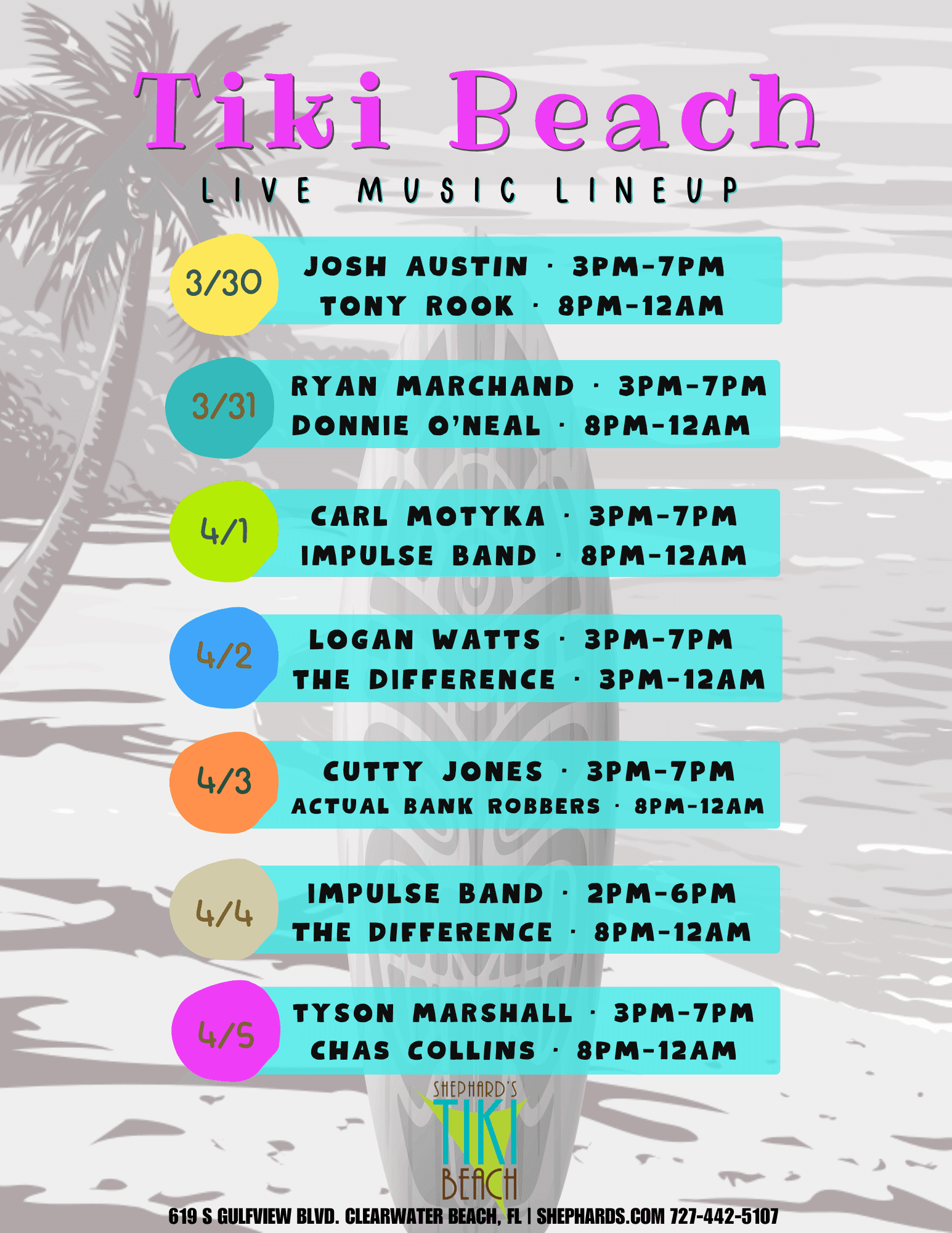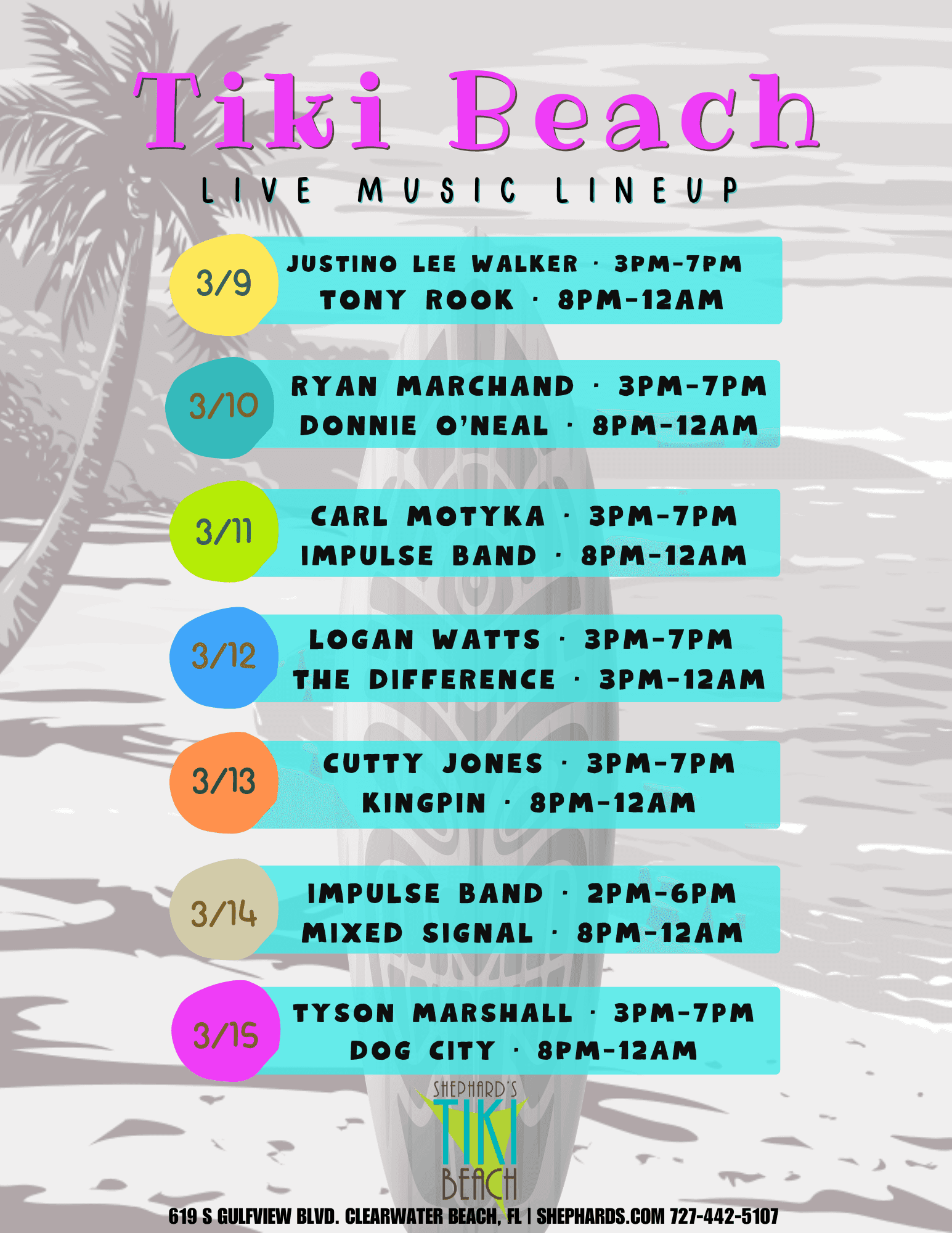 From local to national acts, experience why Shephard's Tiki Beach Bar & Grill is Clearwater Beach's #1 entertainment resort! Open daily to the public at 11 AM with onsite valet parking.